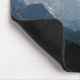 A mouse pad with a photograph of beautiful mountains, cloudy sky, and rolling hills filled with trees in the foreground. Grey blue colour scheme.