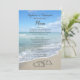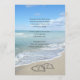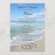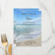 Beautiful beach wedding menu. Scenic hearts in the sand beach image, for visions of relaxation in paradise, celebrate your beach wedding with this lovely design. Two interlocking hearts drawn in the beach sand on the ocean shore, perfect for a destination, island, tropical paradise coastal nautical event. Blue turquoise and tan sand with white waves crashing on the shore.