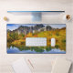 Desk mat with a beautiful country photograph. Mountains of stone with an autumn forest in bright colours. A quiet lake reflects the mountains, trees and grasses.