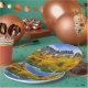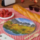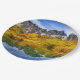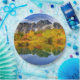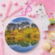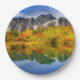 Paper plates with a beautiful country photograph. Mountains of stone with an autumn forest in bright colours. A quiet lake reflects the mountains, trees and grasses.