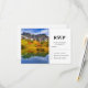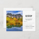 RSVP card with a beautiful country photograph. Stone mountains with an autumn forest in bright colours. A quiet lake reflects the mountains, trees and grasses.