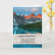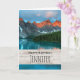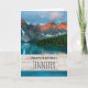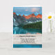 Birthday card with a beautiful photograph featuring a beautiful mountain range, grey and rust colours. A green lush forest surrounds a calm clear lake. Tranquil and peaceful image