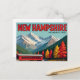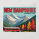 A colourful vintage-style postcard showcasing New Hampshire’s iconic red covered bridge, nestled in vibrant fall foliage and set against the majestic White Mountains—celebrating the Granite State’s natural beauty.