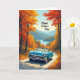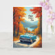 This design shows a classic turquoise convertible 🚗 gliding along a curving asphalt road through an autumn forest, its chrome details catching the light like a polished keepsake. Tall trees crowd in on both sides, their leaves shifting through amber, gold, and deep orange, creating a cozy tunnel that feels made for a shared drive and quiet conversation. In the distance, rolling hills fade into a soft blue haze and cradle a calm lake that reflects the clear sky. Sunlight streams across the scene, laying gentle shadows over the road and adding depth to the layered foliage. Near the top of the card, a short Father’s Day message appears in a flowing white style, arcing slightly across the sky so it stands out without overpowering the artwork. The open-top car suggests someone special in the passenger seat 👨, with the road ahead hinting at easy companionship and steady care. The windshield glints, the tires trace the bend, and scattered leaves line the roadside beneath the glowing canopy.