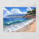 Scenic Seaside Landscape: Beach, Waves, and Mountains in the Background.