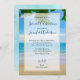 A party invitation with a landscape photograph of a tropical beach. White sand, azure water and blue sky with tropical leaves along the top.