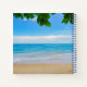 A personalised notebook with a landscape photograph of a tropical beach. Warm sand, azure water and blue sky with tropical leaves along the top.