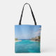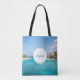 A tote bag with a beautiful photo featuring a tropical beach resort.