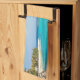 A kitchen towel with a beautiful photo featuring a tropical beach resort.