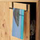 A kitchen towel with a photograph of a scenic tropical caribbean beach.. A white sandy beach and crystal blue waters with a solo thatched umbrella. Secluded and serene.