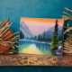 Artistic tabletop plaque features an AI generated digital watercolor scene of a beautiful mountain lake with reflection of trees and horizon