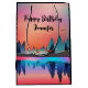A gift bag with a beautiful graphic design featuring a peaceful lake with deer. and tall pine trees being reflected in the water. Stars hover overhead.