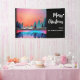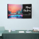 Banner with a beautiful graphic design featuring a peaceful lake with deer. and tall pine trees being reflected in the water. Stars hover overhead.