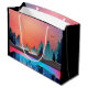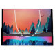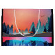 A gift bag with a beautiful graphic design featuring a peaceful lake with deer. and tall pine trees being reflected in the water. Stars hover overhead.