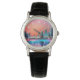 A watch with a beautiful graphic design featuring a peaceful lake with deer. and tall pine trees being reflected in the water.  Stars hover overhead.