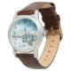 A watch with a beautiful watercolor painting. Pine trees covered with snow in a wintery scene. Snowflakes falling down on a snow-covered ground. White and blue fluffy clouds up in the sky. With a frozen lake in the background. Peaceful moody vibe.