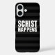 This funny geology-themed iPhone case features the classic pun phrase "Schist Happens." Geology humour at it's...best? The case features bold, white text on a black and grey striped background.