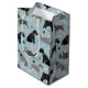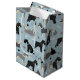 Cute Schnauzer dogs in black, salt and pepper and black and silver coats sit, stand and rollover with scattered dog bones and paw prints on a light blue background.