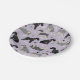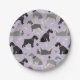 Cute Schnauzer dogs in black, salt and pepper and black and silver coats sit, stand and rollover with scattered dog bones and paw prints on a light purple background.