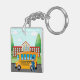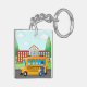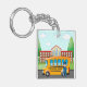 A school bus and its driver outside a school. This design looks really effective on these Keychain