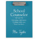 A clean and modern clipboard made just for school counsellors. Featuring a minimalist layout on a calming deep teal background, this design highlights the title "School Counsellor" in a stylish script font, with space to personalise your own message or quote underneath, plus your name at the bottom for a professional touch. Perfect for everyday use or as a thoughtful gift during Appreciation Week, graduation, or the back-to-school season.