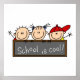 Three stick figure kids with big smiles and a school writing board that reads "School is Cool!" on back to school Tshirts, mugs, cards, stickers, buttons, and more that can be customised.