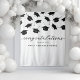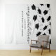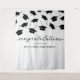 Graduation party tapestry featuring a simple white background that can be changed to any colour, falling black mortarboard caps, and a congratulations text template that is easy to personalise.