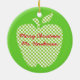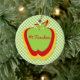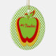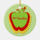 Teacher's Christmas gift ceramic ornament, done in a green and white chequered pattern, with silhouettes of a green, red, and a yellow apple stacked. Red text, on both sides is ready to personalise to read what you want. Excellent gift idea for a teacher this Christmas.