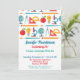 A super cute school themed party birthday invitation featuring a colourful pattern with world globe, protractors, compass, microscope and more. Great for kids or adults.
