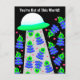 Colourful and fun postcard valentine perfect for grade school or a friend. Multiple aliens and hearts floating down from a spaceship. "You're Out of This World!" "Happy Valentine's Day" on the back.