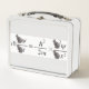 This is a standard metal lunchbox that appears to work just fine. We designed this box ourselves with an uploaded photo and custom text on the front and back. It looks absolutely beautiful except the front of the lunchbox is not centered like it shows in the photo. The print borders don't align with the inset flat part of the box where the preview photo online showed it perfectly centered in there. The back looks nice and centered though.