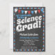 A fun and unique science degree graduation party invitation in chalkboard style with red, white and blue flags and a whimsical polka-dot border with dots on the back.