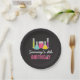 Girls science party dessert plate, perfect for your little scientists' next birthday experiment. Dark grey background with colourful beakers in green, pink, yellow, purple and teal.