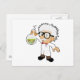 Scientist with glasses holding a beaker with periodic table of elements in posted note form