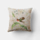 Square throw pillow design features a vintage illustration of the Scintillant Hummingbird. A green and brown hummingbird with a red throat perches on a tropical plant with light blue flowers, on an off-white vintage grunge background with gold swirls and floral silhouettes. Choose from cotton, polyester, or outdoor fabric.
