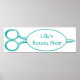 A beautiful drawing of a pair of teal coloured scissors with an oval in the middle. You input your own shop name or saying inside the oval. Perfect for a Beauty Shop or someone who loves to sew.