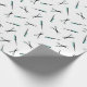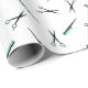 White wrapping paper with a pattern of combs and scissors in black and turquoise.