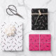 Hair stylist themed wrapping paper sheets featuring three patterns with scissors and combs in different combinations of white, hot pink, and black.