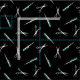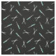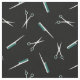 Black fabric with a modern pattern of scissors and combs in white and teal.