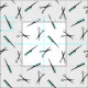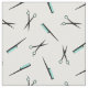Fabric white with a modern pattern of scissors and combs in black and turquoise.