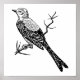 A scissortail bird, named for the forked shape of its tail. This scissortail bird is drawn in bold black and white, with nice feather detail. He is sitting on a branch.