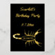 This beautiful foil Birthday Party invitation features a digital art image of a black scorpion with big claws and a large sting on the tail curved above the top of its body, with the word Scorpio in bold black text inside the body of the arachnid. A fun design for people celebrating a Birthday born between October 24 and November 21 under the star sign of Scorpio.