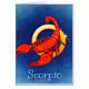 Flat greeting card with colourful illustration features blue background with a red scorpion - the symbol of astrological zodiac sign Scorpio (Oct. 23-Nov. 21).