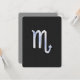 A silver chrome like Scorpio zodiac symbol on a charcoal black snake skin texture print decor. A modern urban racy design for a great custom birthday gift idea.