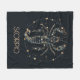 Custom fleece blanket featuring Scorpio zodiac sign constellation with "Scorpio" in mystical typography with dark blue background.