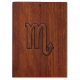 A Scorpio Zodiac Sign applique in a rich brown Mahogany wood grain style print background. A classy modern design for a great custom birthday gift idea.