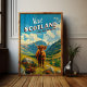 This poster vividly portrays a quintessential scene from the Highlands, featuring a proud Scottish Highland cow standing against a backdrop of towering mountains and lush, verdant hills. The natural beauty of the Highlands is depicted in stunning detail, with the cow's distinctive long horns and shaggy coat adding to the scene's authenticity and charm. The vintage design adds a nostalgic touch, evoking the timeless allure of Scotland's untamed wilderness.