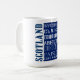 Coffee mug features Subway art graphic of seven of the largest cities in Scotland in blue and white fonts.