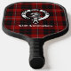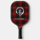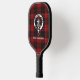Stylish pickleball paddle features Scottish Clan Cunningham crest badge and customisable text on tartan plaid background