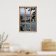 Poster that looks like a window -- fishing boats This window scene shows a harbour in Scotland. The fishing boats are moored in the calm sea water in this traditional harbor which dates back to the 1600s. A rustic wooden window frames the tranquil scene, with the leaves of trees creating an attractive foreground. Beyond you can glimpse the open sea beneath a clouded sky.